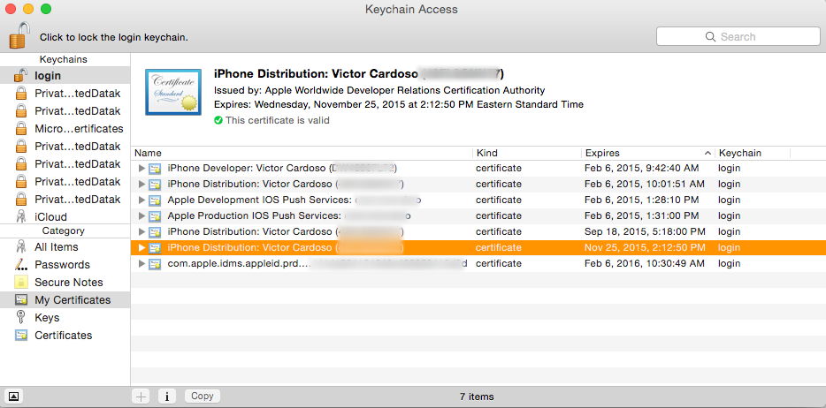 Note: All certificates you have installed will be in the "login" keychain (Label 1) under the category "My Certificates" (Label 2).