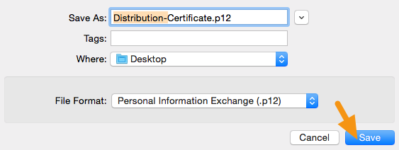 2. In the window that appears, add "Distribution-" to the filename, make sure the File Format is set to "Personal Information Exchange (.p12)" and click on "Save" to save it to your machine.